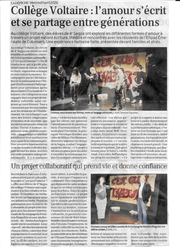 Ce projet, inscrit dans le cadre du Parcours d’éducation artistique et culturelle, développe des compétences en expression écrite, orale et corporelle tout en valorisant l’engagement des élèves et le partage intergénérationnel.