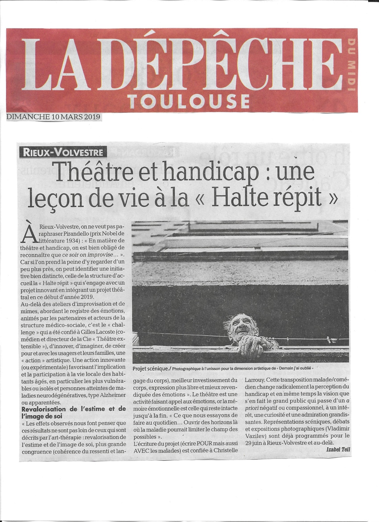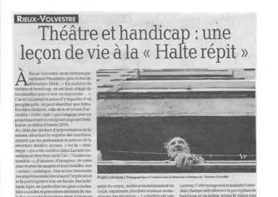 Cette exposition a été réalisée avec le spectacle Demain j’ai oublié afin de créer une passerelle entre les arts visuels et les arts de la scène. Ce travail est réalisé au sein de L’EHPAD, SSIAD (services de soins infirmiers à domicile) et la Halte-Répit de Rieux -Volvestre, Haute – Garonne.